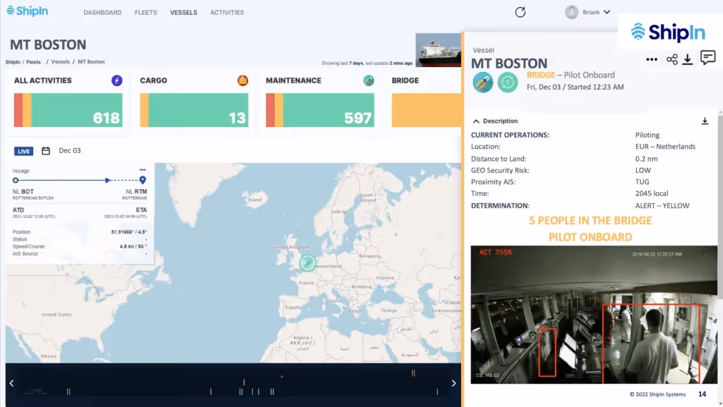 ShipIn sends a network of cameras that crew can install on ships in high-traffic or high-security areas, like the bridge, engineering room, and cargo hold. Rather than watching hundreds of thousands of hours of footage, our proprietary AI technology scans through to identify events and activities of interest, such as real-time hazard and security detection, and patterns, such as time spent in port.